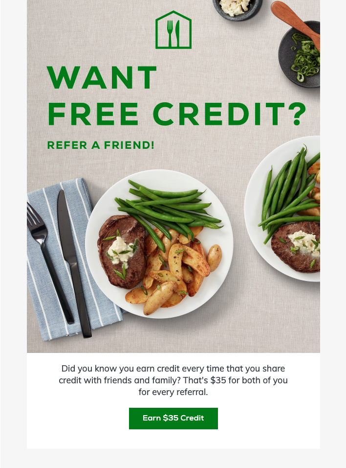 Home Chef invia una brevissima e-mail per promuovere il loro programma di referral, ma hanno un CTA molto convincente "Guadagna $ 35 di credito" che sottolinea il vantaggio per i referrer.