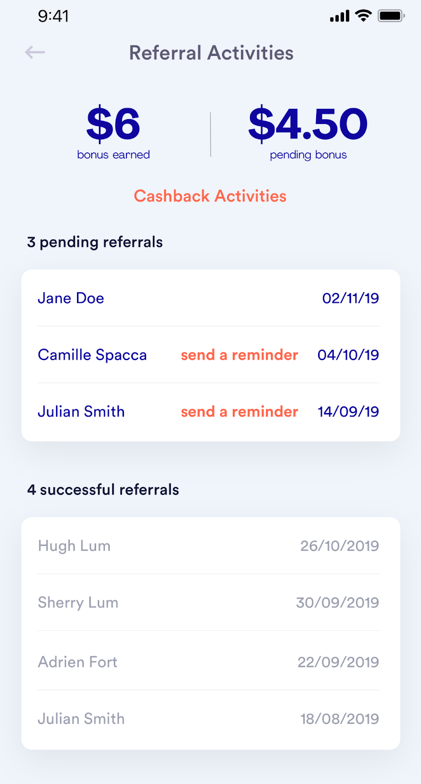 Esempi: Eatsy offre una pagina nella propria app mobile che mostra lo stato di tutti i referral effettuati da un cliente e consente loro di inviare promemoria agli amici che non hanno ancora utilizzato l'offerta. Mostra anche la quantità di incentivi a disposizione dell'avvocato.