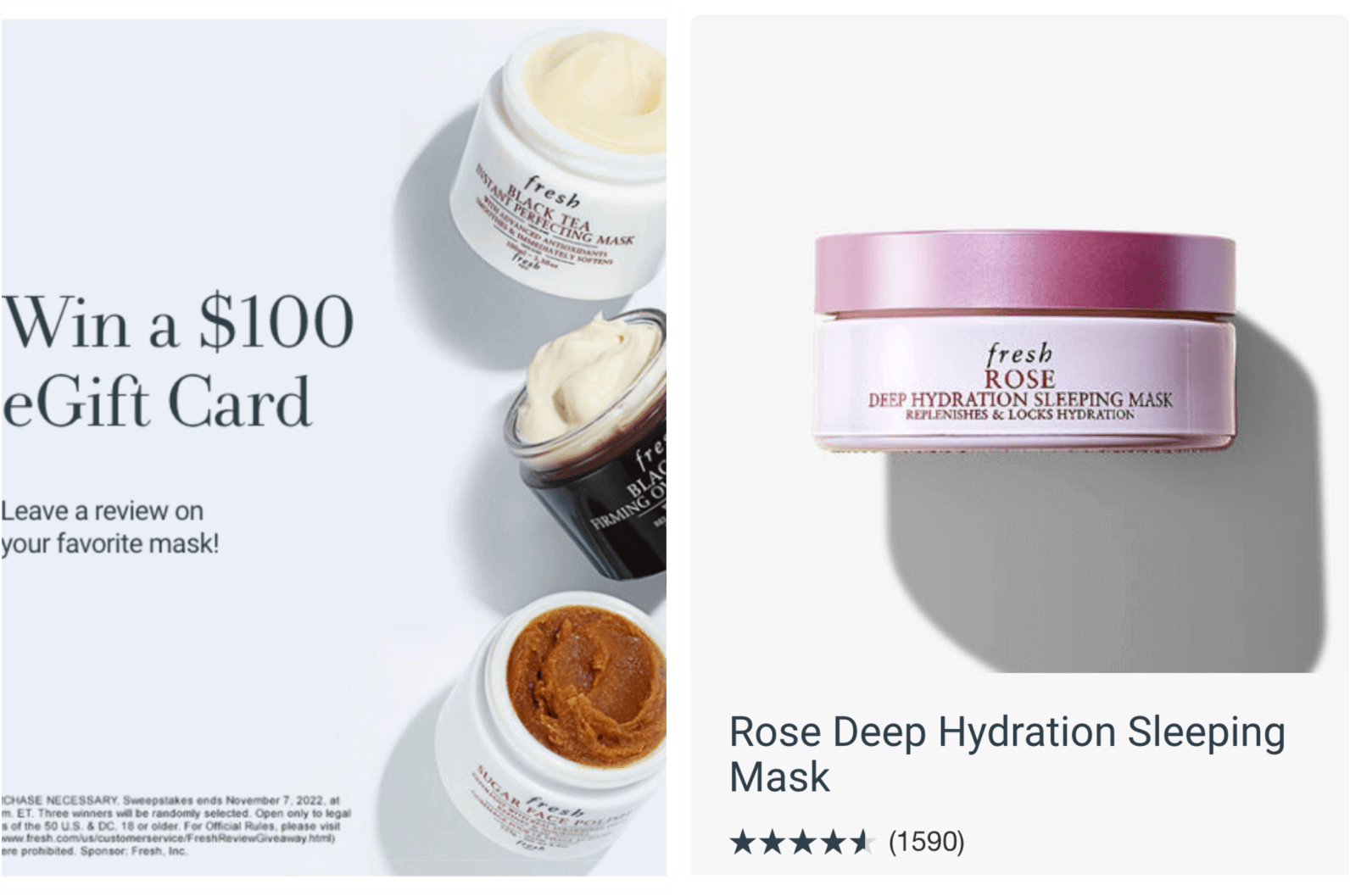 Il marchio di cosmetici naturali Fresh voleva aumentare le vendite e la consapevolezza del marchio e creare fiducia. L'azienda ha collaborato con Bazaarvoice per lanciare una campagna di lotterie incoraggiando i clienti a lasciare una recensione del loro prodotto preferito della collezione Rose. Coloro che hanno partecipato hanno avuto la possibilità di vincere una carta regalo elettronica da $ 100.