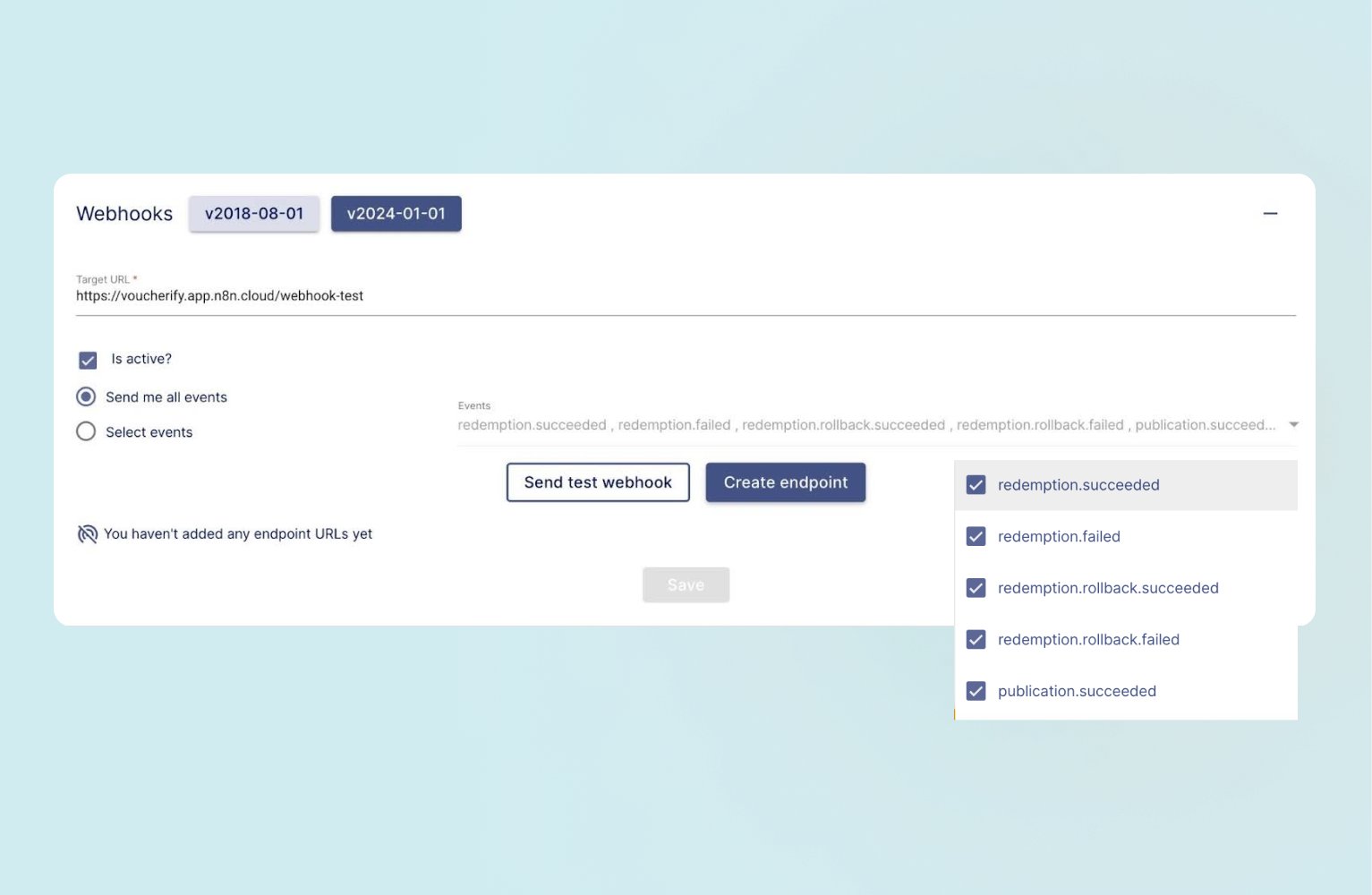 Un webhook consente a Voucherify di inviare aggiornamenti in tempo reale alla tua app o agli endpoint URL. Gli aggiornamenti vengono attivati da tutti o eventi specifici in Voucherify e inviati al tuo URL tramite richieste HTTP. Puoi creare webhook nelle Impostazioni progetto selezionando quali eventi dovrebbero attivare i webhook e specificando l'URL di destinazione (l'URL è impostato nel flusso di lavoro n8n). Puoi ricevere tutti gli eventi o scegliere di ascoltare solo gli eventi di riscatto.