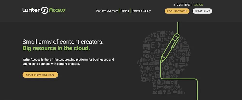 WriterAccess è una piattaforma per assumere scrittori di social media freelance. L'azienda addebita ai clienti una quota di abbonamento mensile per utilizzare il servizio che offre diversi strumenti per gestire i tuoi contenuti. Oltre alla quota di abbonamento, devi anche pagare per ogni contenuto ordinato.