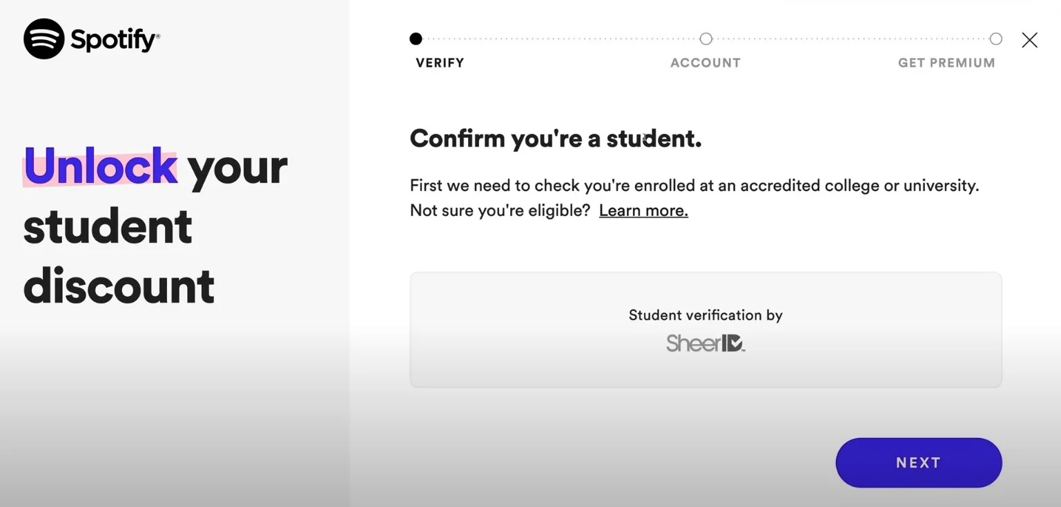 Devi essere indirizzato alla pagina in cui ti verrà chiesto di attivare lo sconto per studenti su Spotify dopo aver completato il reindirizzamento. Per abbonarsi come studente, è necessario inviare una verifica dell'identità. SheerID è il nome del servizio di verifica utilizzato per eseguire questa operazione.