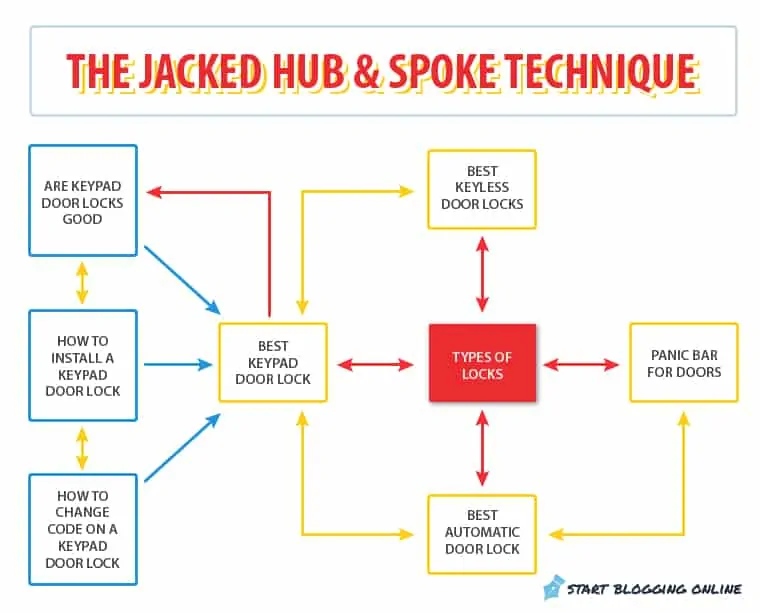 Le frecce gialle rappresentano i collegamenti tra le pagine dei raggi. Come puoi vedere, "migliori serrature per porte senza chiave" si collegano a "migliori serrature per porte con tastiera" e viceversa.