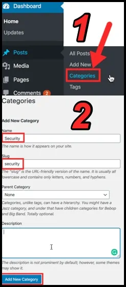 - Sul lato sinistro dello schermo, compila il nome della categoria e lo slug, quindi fai clic sul pulsante "Aggiungi nuova categoria".