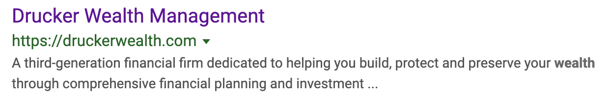 以下の例では、TwentyOverTenのクライアントであるDruckerWealthManagementがメタディスクリプションを使用してキーワードを組み込み、検索者がサイトをより見やすくします。