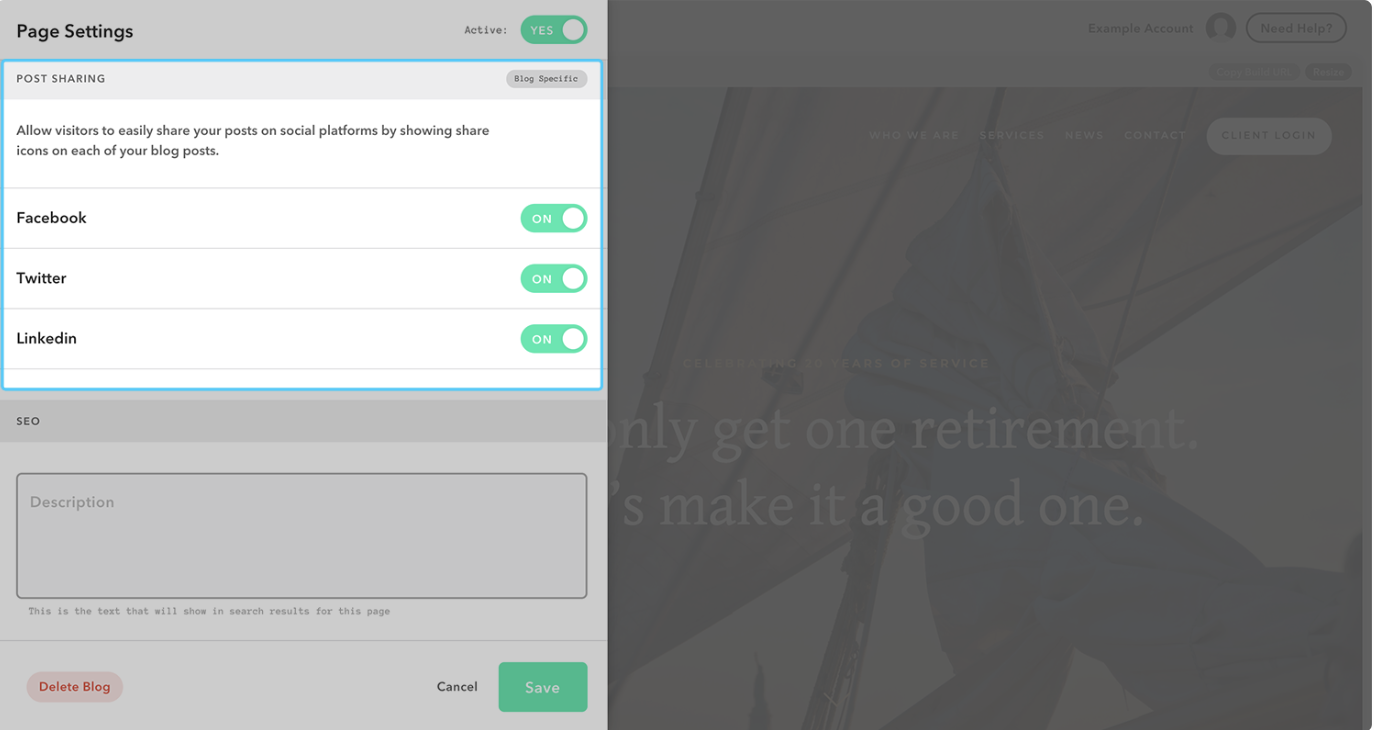 Twenty Over Tenプラットフォームを使用すると、ブログ投稿をソーシャルで1、2、3と同じくらい簡単に共有できます。 まず、[ページ設定]ウィンドウが表示されます。 次に、[投稿の共有]が表示されるまで下にスクロールします。 ブログ投稿を共有できるソーシャルプラットフォームを制御するには、各ソーシャルメディアアカウントの切り替えをクリックして目的の設定にします。