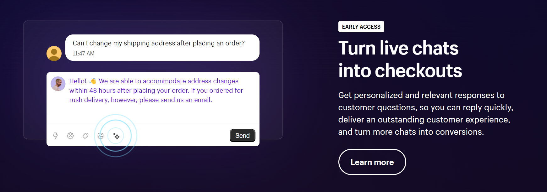 たとえば、 Shopify Magic は、顧客の質問に対してパーソナライズされた回答を提供することで「ライブ チャットをチェックアウトに変える」ように設計された生成ツールです。 これにより、すべての Shopify サイトに案内係と販売アシスタントが提供され、パーソナライズされた応答性の高いインタラクションによって訪問者の関心を維持し、コンバージョンへの道を歩むことができます。