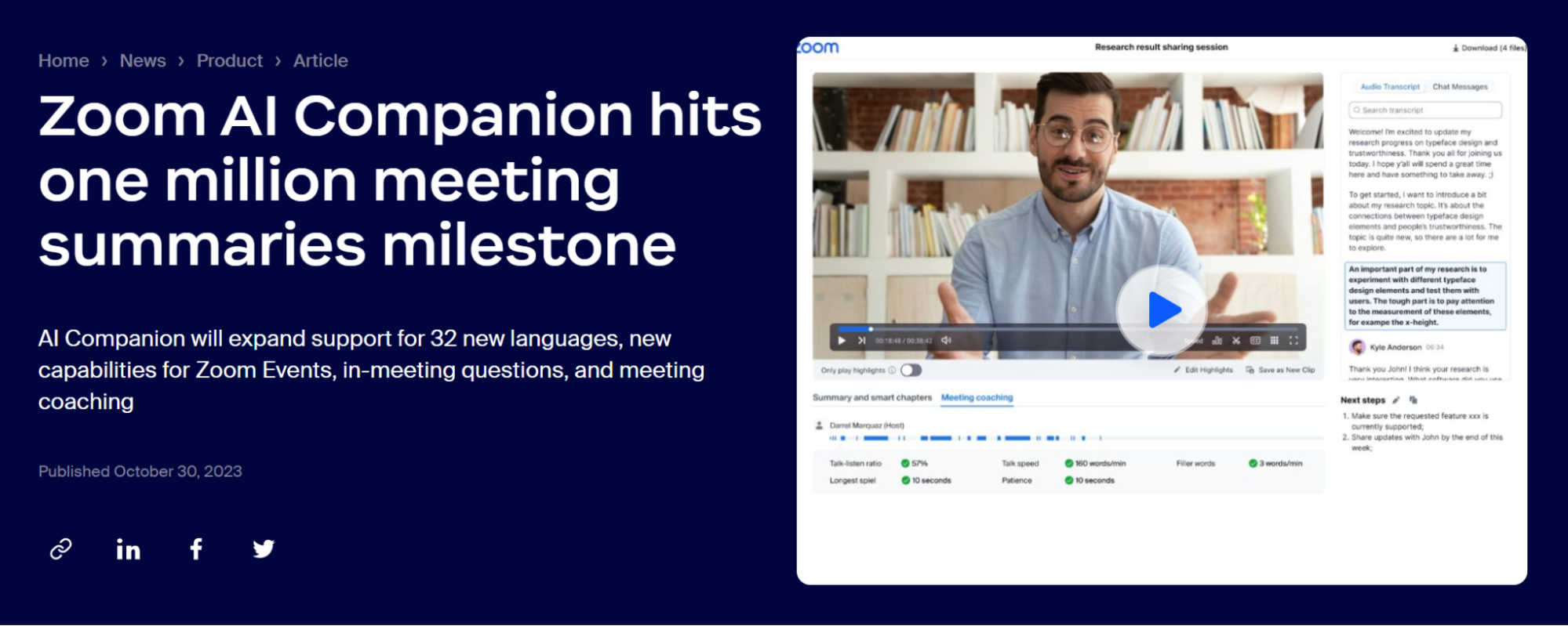 これは単純な使用例ですが、時間に余裕のない営業担当者やマーケティング戦略家にとっては大きな違いをもたらします。 Zoom の AI Companion は、 2023 年 10 月に会議概要の数が 100 万件を超えたため、この機能は今後も利用できないと言っても過言ではありません。