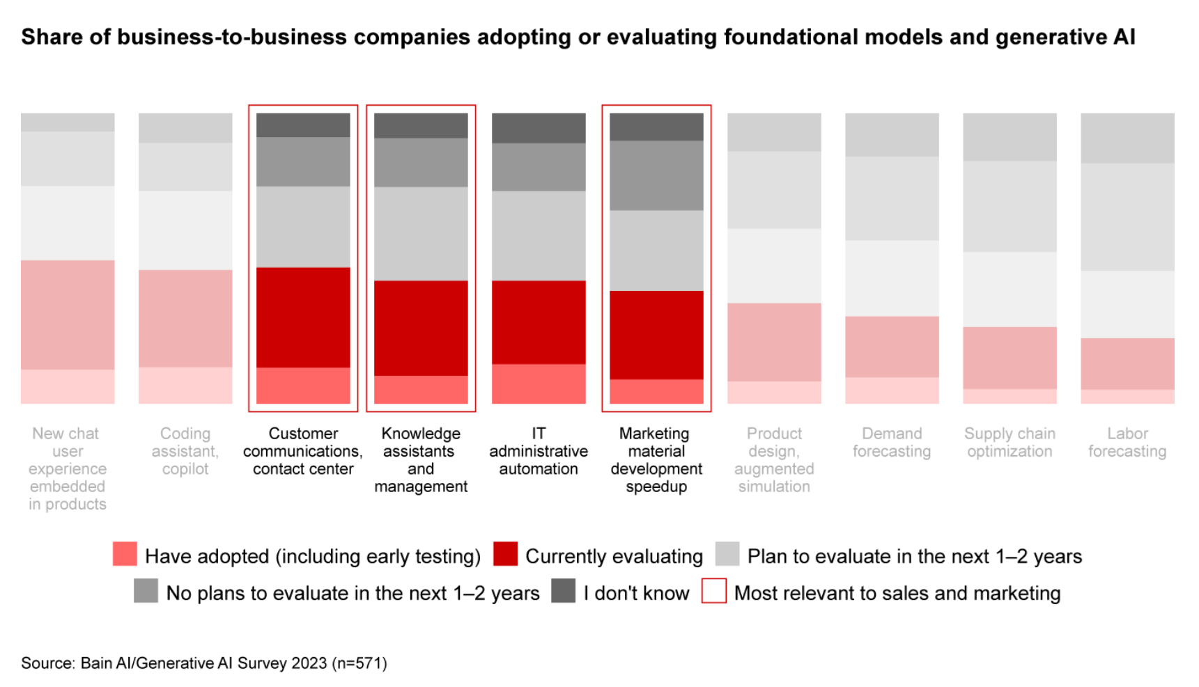 Bain & Co によると、大多数の企業は現在、生成 AI の利点を評価しているか、近い将来評価する予定です。