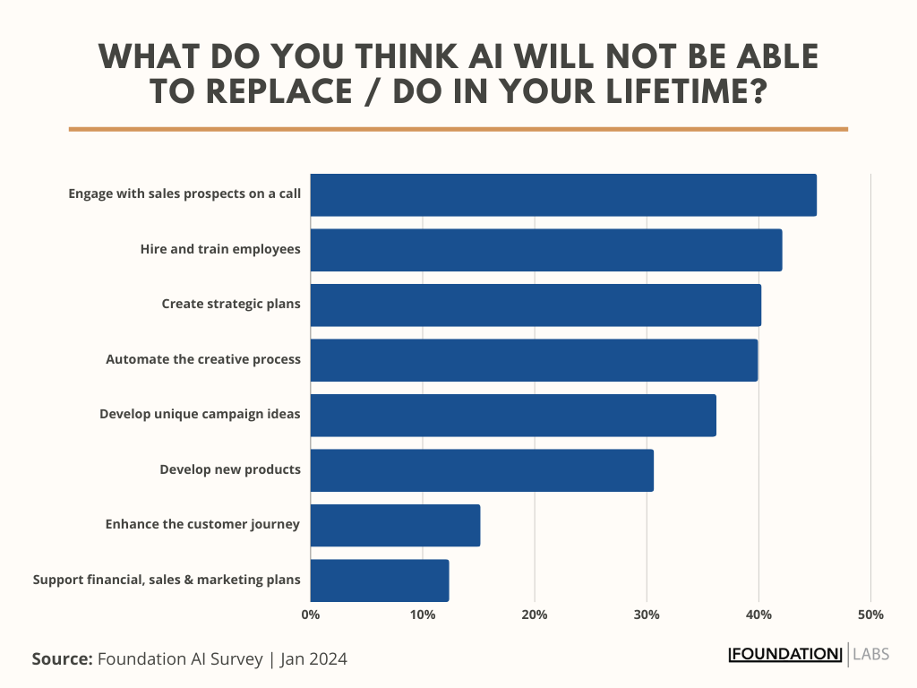 とはいえ、特にミッションクリティカルなタスクに関しては、専門家が AI の完全な引き継ぎに参加しているわけではありません。 当社の 2024 年のマーケティングにおける AI 調査によると、かなりの数の回答者が、AI を使用して見込み顧客との電話でのやり取り (45%)や戦略計画の立案 (40%)に懐疑的です。