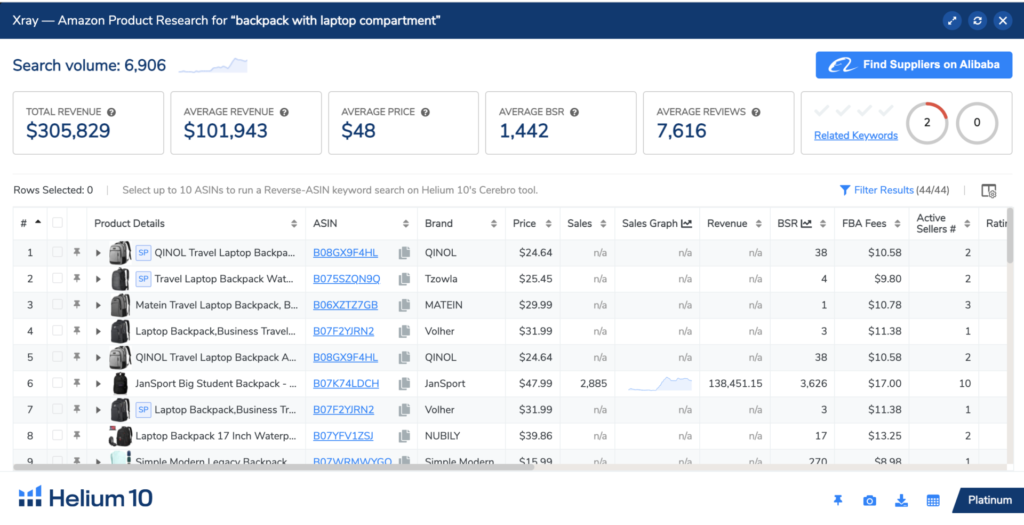 amazon.comにアクセスし、同じキーワードを入力し、Helium 10 Chrome拡張ツールを使用してX線検索を実行し、上位10のASINを特定しましょう。 製品と機能の点で最も類似していて、同じ価格帯でスポンサーなしの製品を特定する必要があります(スポンサー付きブランドは検索結果の上部に表示されるように支払われています)。 価格帯がわからない場合は、Xrayがベンチマークとして使用できる平均価格を提供します。