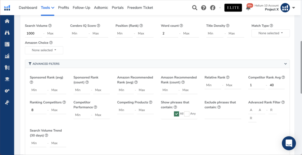 最小検索ボリュームと単語数フィルターを同じに保ちますが、ランキング競争の最小値を9に変更し、競合他社のランク平均フィルターから数値を削除します。 これにより、検索範囲が広がり、コピーの箇条書きに追加できる可能性のある関連キーワードが得られます。 複数のフィルターを試すことを恐れないでください! 実験は、あなたのリストや製品に関連するキーワードを見つけるための最良の方法です!