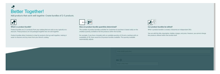 Product Bundlesパイロットプログラムを使用すると、FBAの販売者は、バンドル割引の有無にかかわらず、製品を仮想的にバンドルできます。 バンドルには、単一のカタログから最大5つの商品を含めることができ、Amazonは、バンドル内の在庫が最も少ない商品の在庫状況に基づいて数量を自動的に更新します。 商品バンドルを作成すると、Amazonはそれに固有のSKUを割り当て、商品のタイトル、説明、箇条書き、画像、価格を個別に編集できます。
