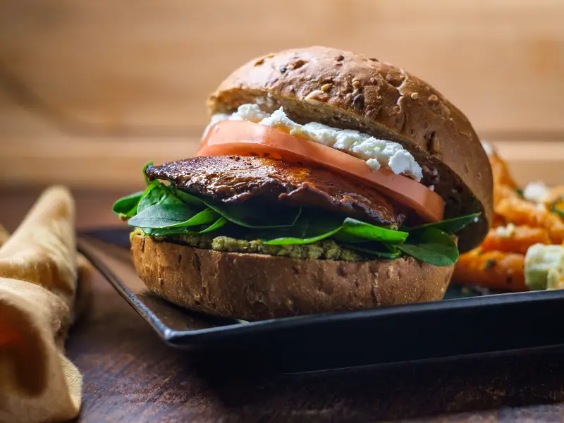 ベジタリアンの常連客にとって、ジューシーにグリルしたポートベロ マッシュルーム キャップは、伝統的なミート パティの素晴らしい代替品になります。 その上にスイスチーズのスライス、新鮮なレタス、熟したトマト、ガーリックアイオリスプレッドをトッピングします。 このボリュームたっぷりのサンドイッチは、風味を損なうことなく、あらゆる食事の好みに対応します。