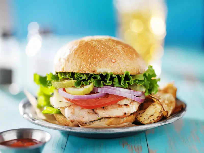 グリルした鶏胸肉を使用し、シャープなチェダーチーズ、クリーミーなモッツァレラチーズ、スモーキーなゴーダチーズなど、お好みのとろけるチーズをトッピングして、質素なチキンサンドイッチを新たなレベルに引き上げましょう。 シャキシャキのレタス、熟したトマト、ピリッとしたマヨネーズベースのスプレッドを加えれば、グルメなひねりを加えたクラシックな料理が完成します。