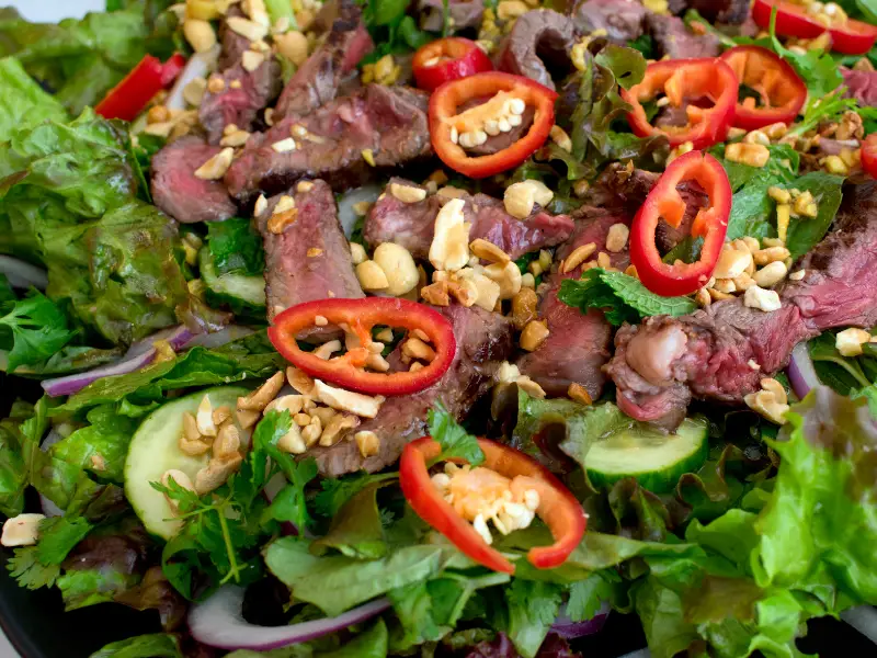 風味豊かでさわやかなサラダをお求めなら、タイ風ビーフサラダをお試しください。 グリルした牛肉をキュウリ、トマト、玉ねぎとピリッとしたライムと魚醤のドレッシングで和えて、味の美しいコントラストを楽しめます。 ミントやコリアンダーなどのフレッシュハーブを加えるとさらに新鮮さが加わり、バーメニューの軽いオプションとして最適です。