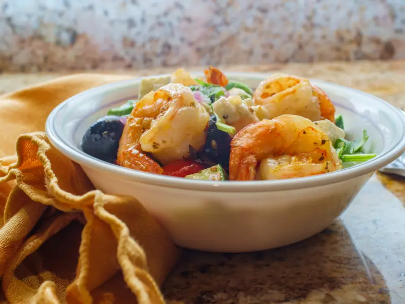 新鮮なキュウリ、トマト、カラマタオリーブ、フェタチーズが入った古典的なギリシャ風サラダに、グリルしたエビを加えることで、しっかりとした料理になります。 ほんのりスモーキーでジューシーなエビが、このサラダをサイドディッシュから風味豊かなメインコースに引き上げます。
