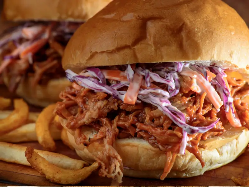 じっくり調理したジューシーなプルドポークに、ピリッとしたカリカリのコールスローをトッピングし、柔らかいブリオッシュパンに挟んで、風味豊かな贅沢なサンドイッチを作ります。 食感と風味のコントラストが楽しめるこのサンドイッチは、バーメニューとしては満足のいく選択肢です。