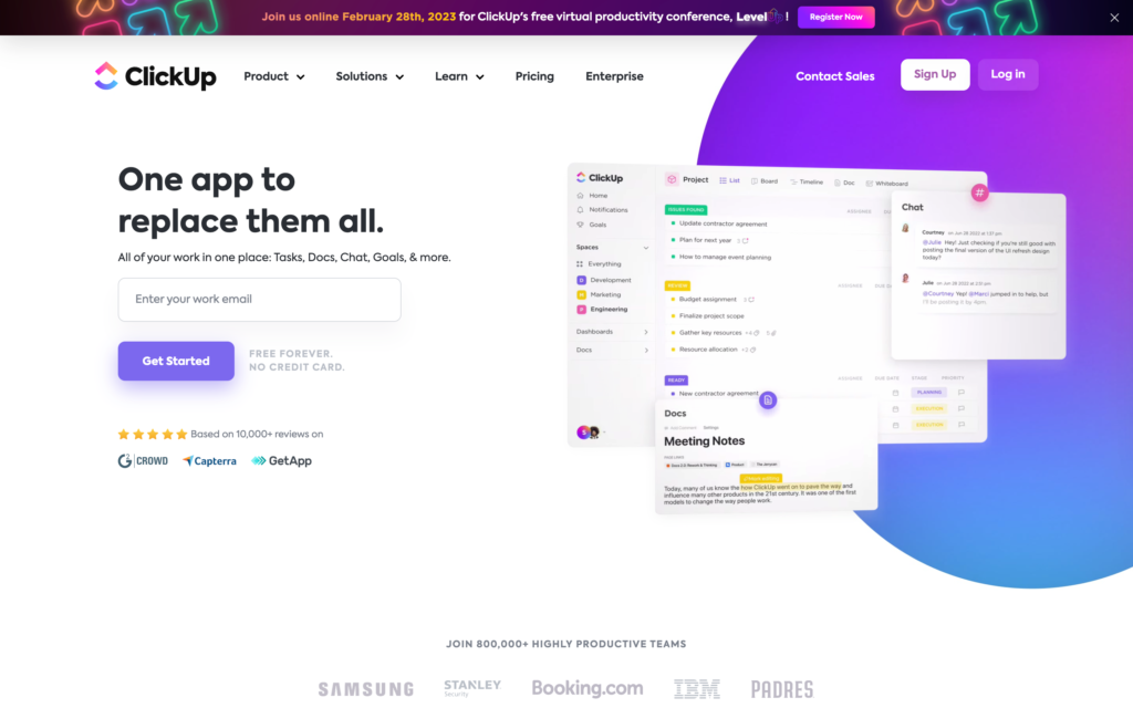 ClickUp のクラウドベースの作業管理システムは、チームがタスクを整理するのを支援することに重点を置いています。 それらの機能には、タスク管理、時間追跡ツール、およびプロジェクト ワークフローを管理するためのかんばんボードが含まれます。