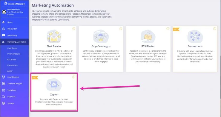 MobileMonkeyでこれを行うには、Marketing Automation –Zapierに移動します。