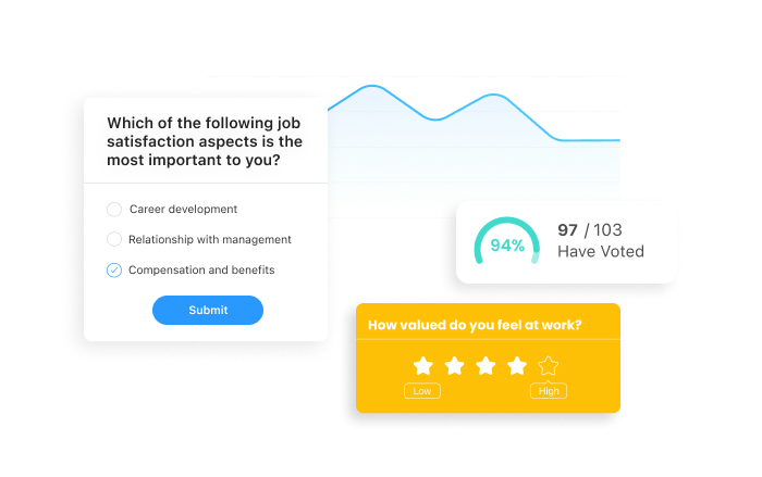 これらのツールを使用すると、雇用主は従業員が記入するアンケートや投票を作成できます。 テンプレートからアンケートを作成したり、従業員やビジネスに関連する情報でアンケートをカスタマイズしたりできます。 また、カスタム アンケートを作成することもできます。また、一部のアプリでは、フィードバックをすぐに収集できるライブ アンケートを提供しています。