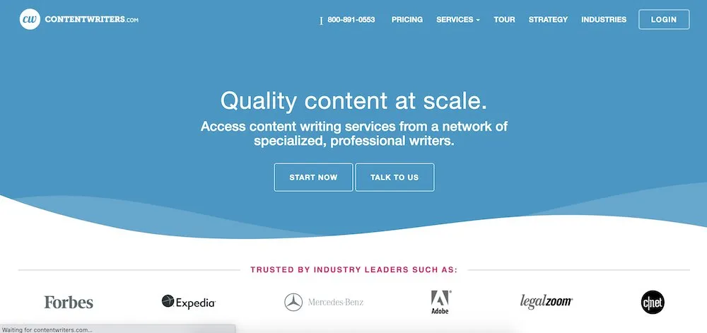 ContentWritersは、フルマネージドのゴーストライターサービスを提供する大手コンテンツライティングエージェンシーです。 ブログの投稿、製品の説明、プレスリリース、ソーシャルメディアの投稿など、さまざまな種類のコンテンツを注文できるプラットフォームがあります。 次に、彼らはその仕事に適した作家を注意深く選択し、コンテンツは編集者によって書かれ、編集され、プラットフォーム内での承認のためにあなたに送られます。