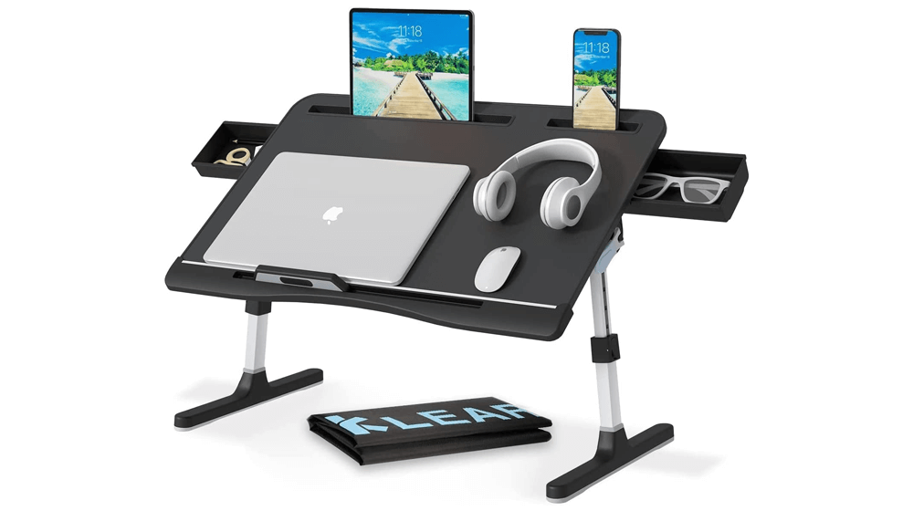このラップデスクには、高さ調節可能な脚と傾斜調節可能な表面があり、幅 15.7 インチ x 幅 23.6 インチと非常に大きく、ほぼすべてのサイズのラップトップと互換性があります。 また、2 つのミニ引き出しが内蔵されており、巾着キャリー バッグが付属しています。
