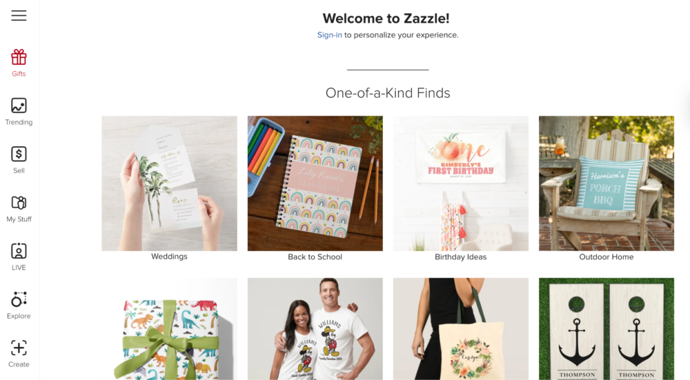 Zazzle は、アーティスト向けの初期のオンデマンド印刷サイトの 1 つです。 彼らはカスタマイズ可能なデザインを専門としており、顧客は結婚式の招待状、名前が印刷されたTシャツなどを注文できます.