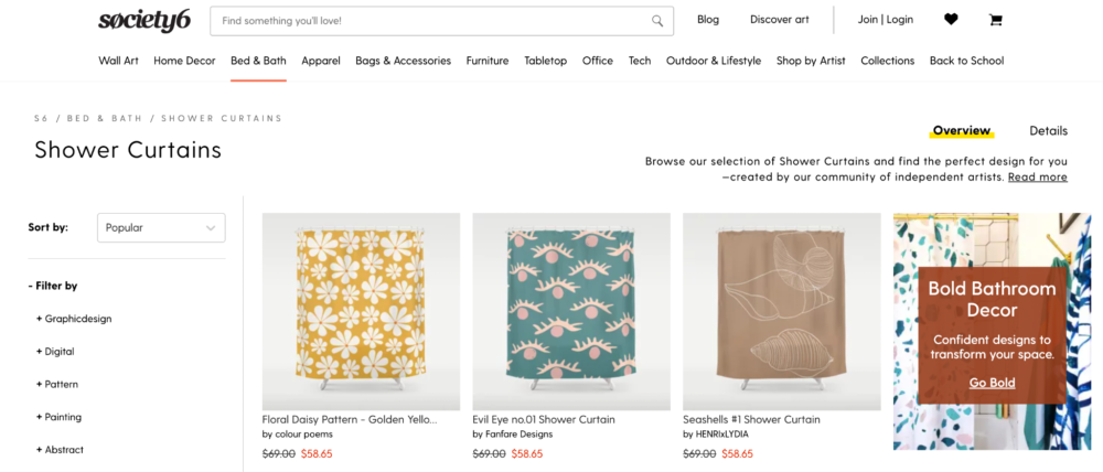 Society6 には独自の雰囲気があり、美しい額入りプリント、タペストリー、シャワー カーテン、ベッドカバーなどの家庭用製品に重点を置いています。 これは、デザイナーや風景写真家がおそらくここで最もくつろげることを意味しますが、誰でも大歓迎です。