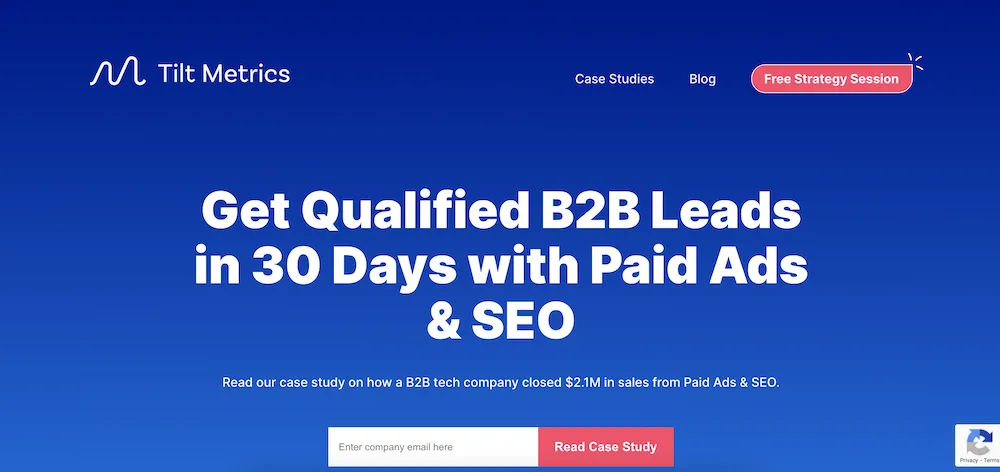 Tilt Metricsは、企業がPPCとSEOでより適格なリードを獲得するのを支援するB2Bデジタルマーケティングエージェンシーです。 彼らはGoogle広告とYouTube広告のSEMを支援することができます。 Tilt Metricsは、SEMを支援するための3つのステップのプロセスに従います。