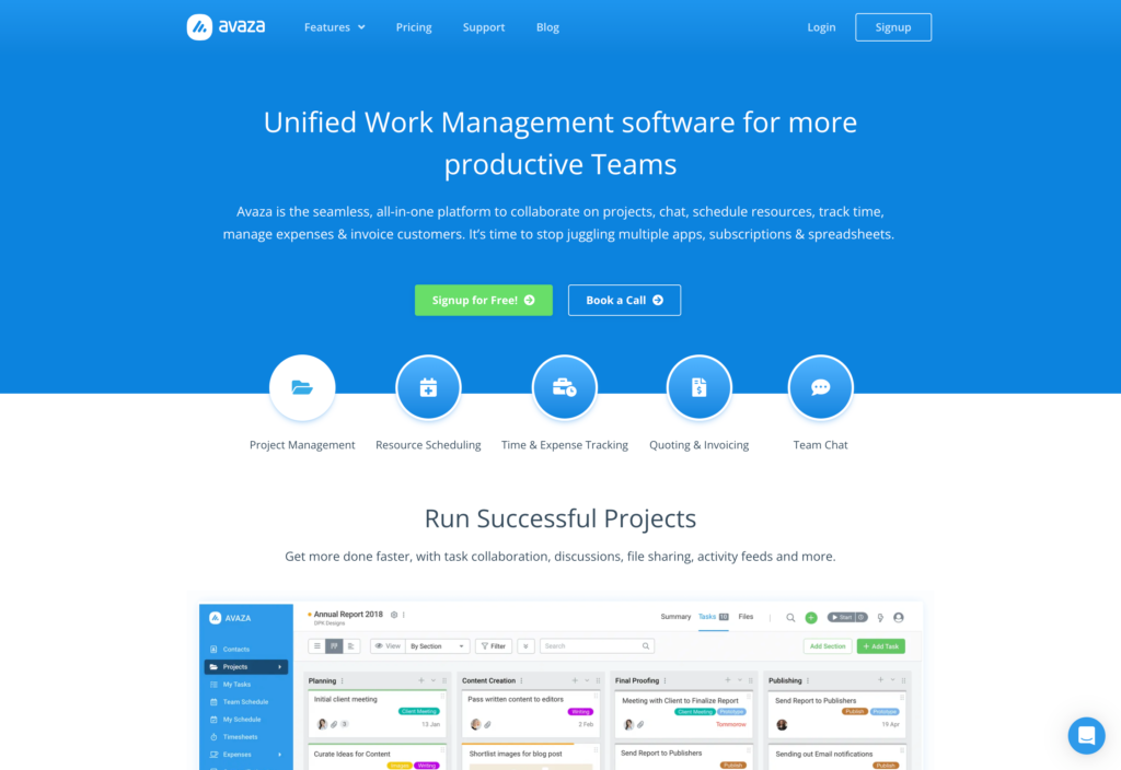 Avaza には、時間追跡に加えて、タスク管理を合理化するために設計された多くの機能があります。 たとえば、このソフトウェアには、スタッフやリソースをさまざまなプロジェクトに簡単に割り当てることができるスケジュール オプションがあります。 また、Avaza Chat を使用すると、チーム同士やクライアントとの 1 対 1 またはグループ チャットでのコミュニケーションが簡単になります。