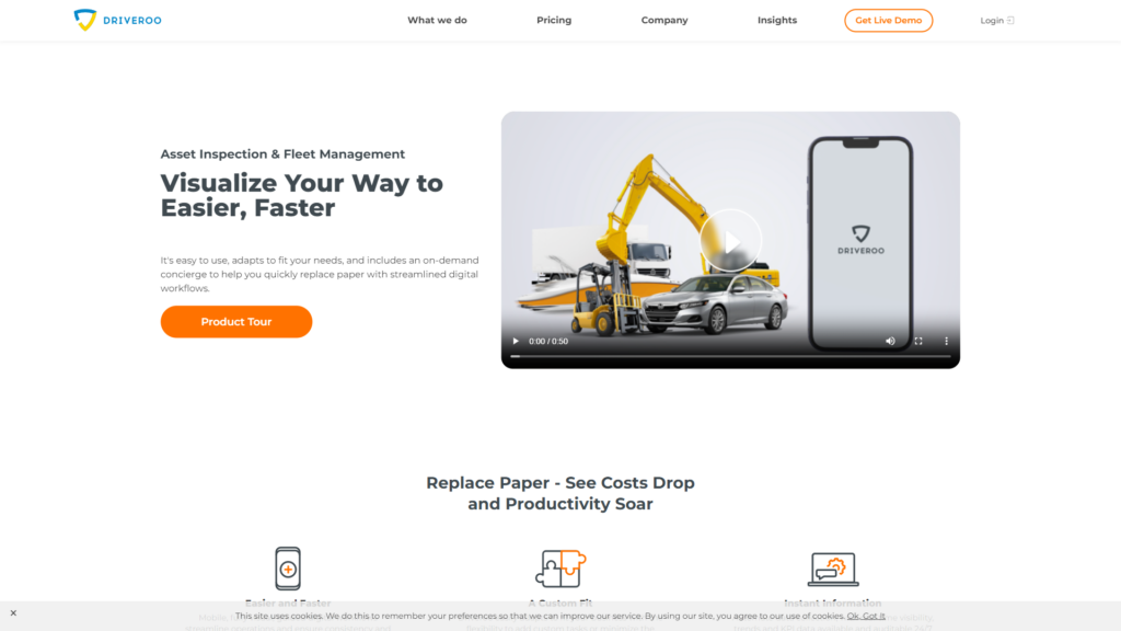 Driveroo ホームページのスクリーンショット。プラットフォームに関する情報と、複数の車両を映したビデオが表示されています。