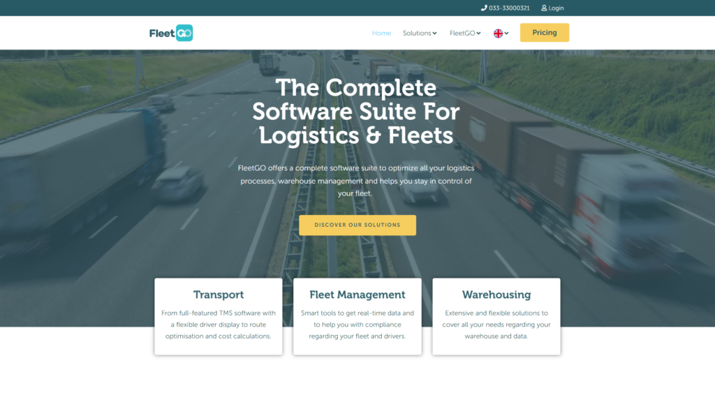 FleetGO ホームページのスクリーンショット。背景に道路とトラックの画像とともにプラットフォームに関する情報が表示されています。