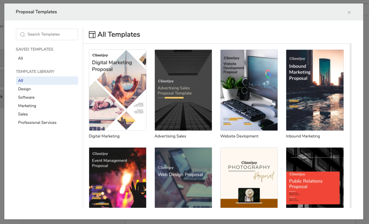 まず、レビューした他のいくつかのツールで見たような、非常に単純で最小限の提案を期待していました。 Clientjoyのレビューではそうではありません。 実際、クライアント向けのフリーランスのプロポーザルを作成するときに、たくさんのプロポーザルテンプレートから選択できるのを見て嬉しく思いました。
