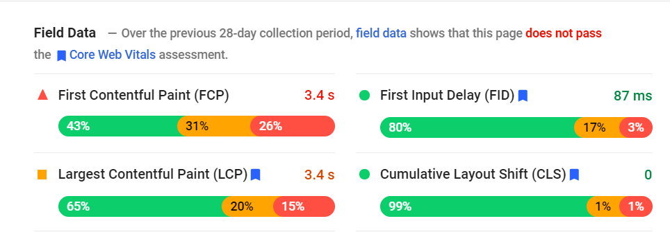 上で述べたように、フィールドデータは、Googleが実際に検索アルゴリズムに導入しているものです。 これは、ユーザーがサイトにアクセスしたときにChromeユーザーエクスペリエンスレポート(またはCrUX)によって収集された実際のユーザーエクスペリエンスを表します。 次に、Googleはそれらのスコアの75パーセンタイルを調べます。これは、アルゴリズムで使用される実際の「スコア」です。