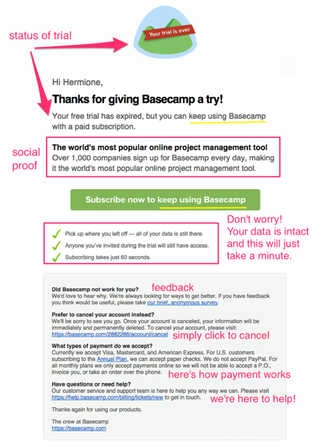 Basecampを例にとってみましょう。 これらは、顧客を無料トライアルから有料プランに移行するために電子メールに依存する巨大なSaaSプロジェクト管理ソフトウェアです。 これが彼らの実際のメールの1つであり、最も重要なマーケティングコンポーネントごとに分類されています。