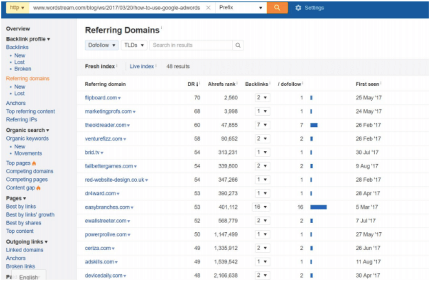 ここから、参照ドメインをクリックして dofollow リンクのみを提供するサイトに絞り込み、ドメイン評価が最も高いサイトから順に並べ替えて、最も価値のあるサイトを最初にターゲットにしました。