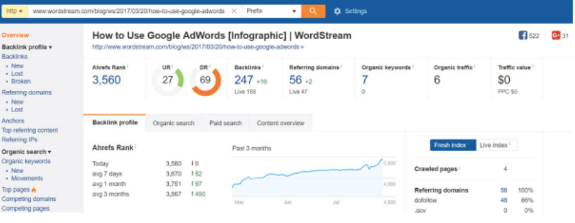 連絡先となる見込み客を見つけるために、Wordstream の投稿に誰がリンクしているかを調べました。 これは、ランキングされている URL を取得して Ahrefs に入力することで行いました。