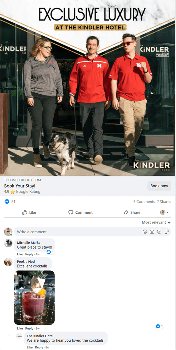 一方、Facebookでの賞賛のパターン(Kindler Hotelに関するこのようなもの)は、顧客を幸せにするものを手がかりにすることができます。