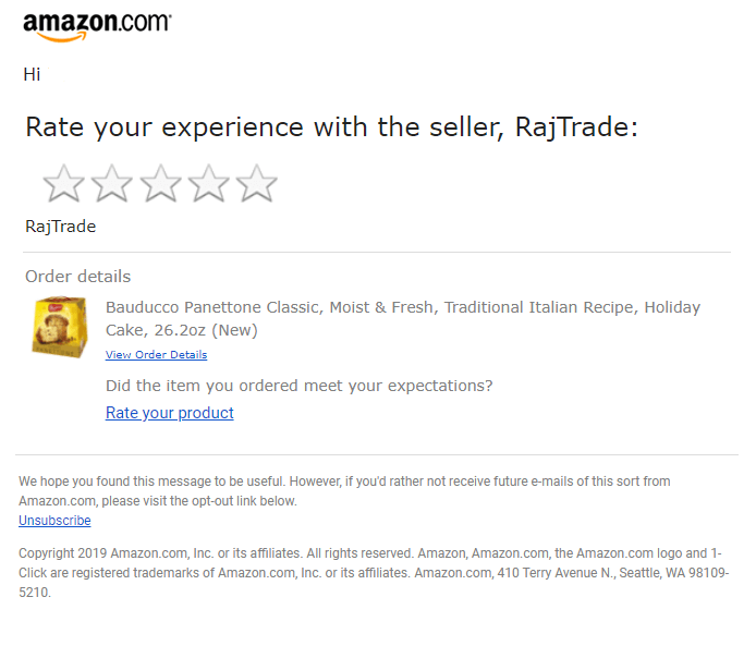 レビューを集めるときは、大量に集めることを目指してください 最近のレビューの。 これは、インタラクション後の電子メール(PIE)などのターゲットを絞ったアプローチを使用して行うことができます。 アマゾンからのこのようなPIEメッセージは、購入後に星の評価を与えるように顧客に促します。