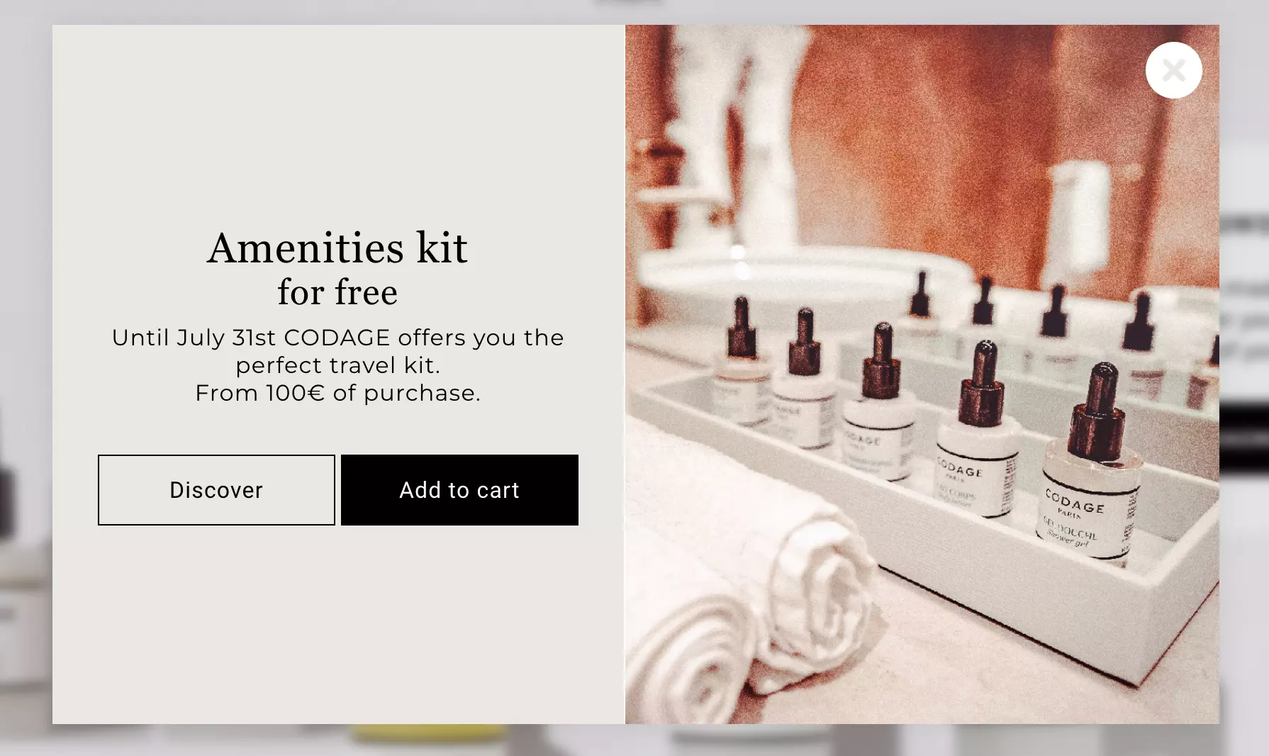 この割引ポップアップの例は、ブランドのアップセルと平均注文額の増加に役立ちます。 訪問者の購買意欲を高めるために、特定の商品を 100% 割引で提供しています。 製品 (トラベル キット) の選択も正しいです。それは顧客に複数の製品を紹介します。