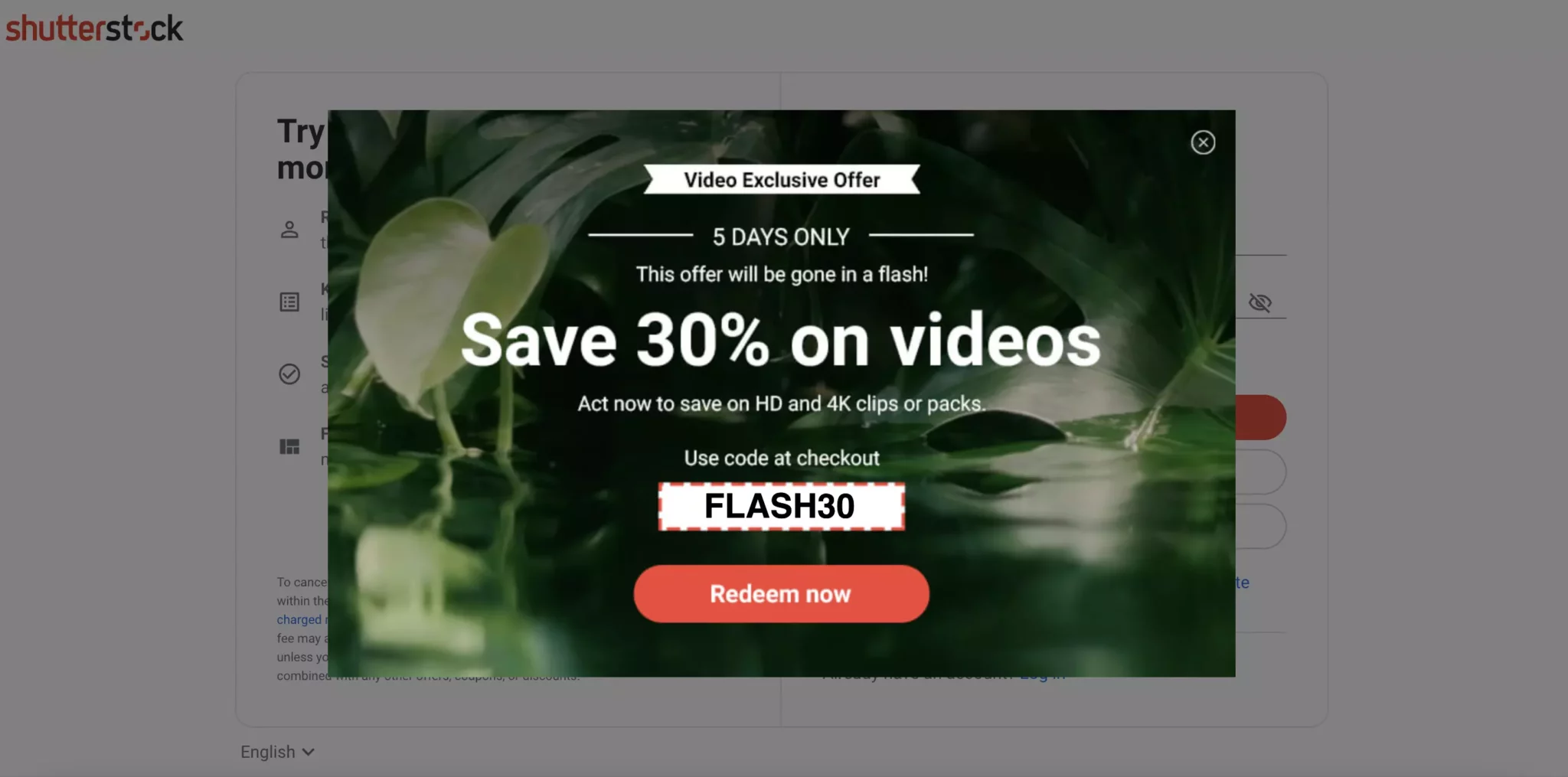 訪問者が Shutterstock ポップアップで [今すぐ交換] をクリックすると、製品カテゴリに直接移動します。 訪問者がホームページからより多くのページを探索するように誘導することにより、ビジネスの成長を支援する効果的な方法です。