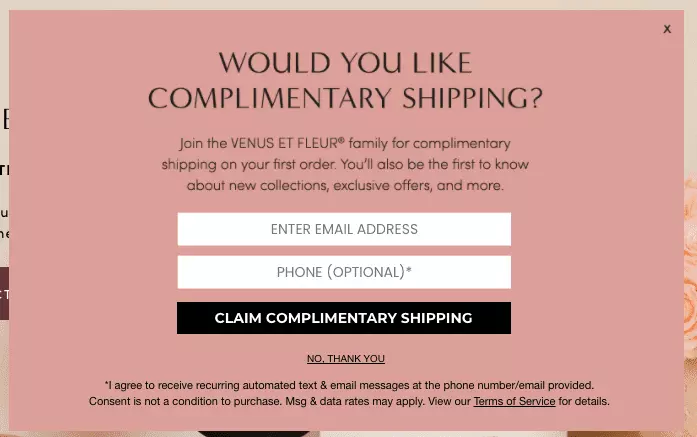 人気のある顧客紹介プログラムを構築したいですか? この Saint Jane Beauty の例のような割引ポップアップで紹介を促進できます。 このようにして、すべての訪問者にこのオファーについて知らせ、自動操縦で売り上げを得ることができます.