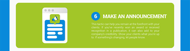 この戦術は、クライアントの最前線に立ち続けるのに役立ちます。 最近、出版物で賞を受賞したり、認められたりした場合は、会社の信頼性を高めることもできます。