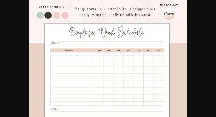 - 柔軟性:テンプレートのスケジュールは、さまざまな部門、役職、シフトのニーズに合わせてカスタマイズでき、Canva、Excel、Google スプレッドシートなどのプログラムで使用できます。