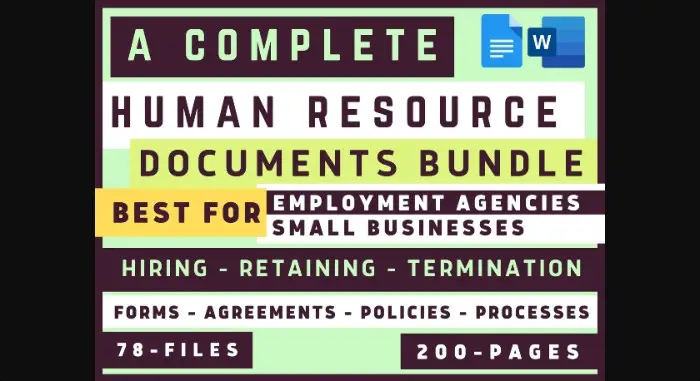 これらの文書は、中小企業や人材派遣会社が雇用および雇用業務を合理化するために設計されています。 ドキュメントは Microsoft Word および Google Docs 形式であり、著作権で保護されており、すぐに使用でき、再販はできません。 ただし、地域の法律は、コンプライアンスを確保するために弁護士と一緒に確認する必要があります。