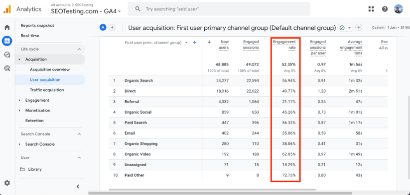このレポートの一番下までスクロールすると、すべての獲得チャネルをリストした表が表示されます。 このボックスの 1 つの列には、そのチャネルのエンゲージメント率がリストされます。