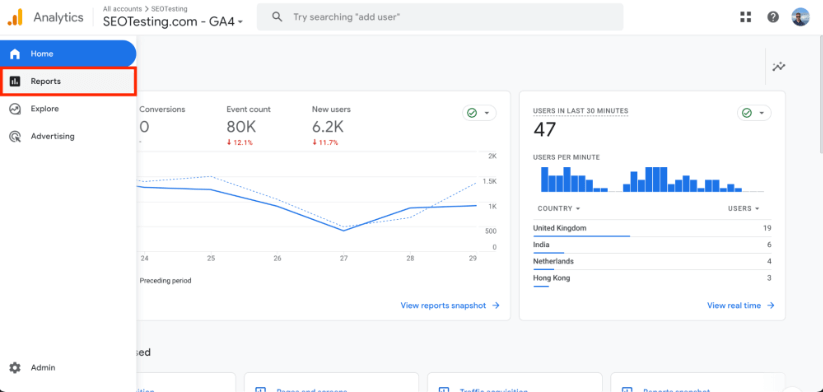 [レポート] タブを強調表示した Google アナリティクス 4 のスクリーンショット。