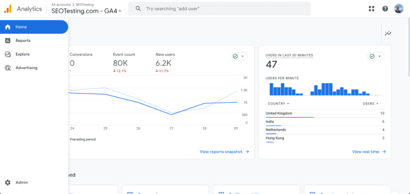 サイドバーが表示された Google アナリティクス 4 ダッシュボード。