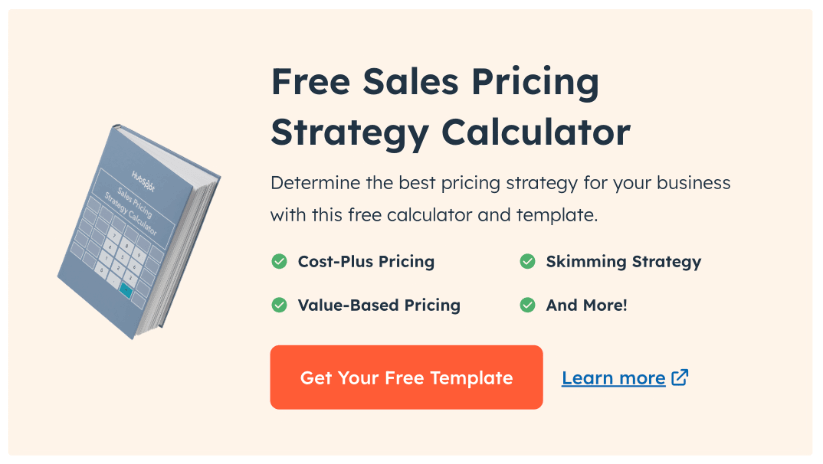 HubSpot の無料販売価格戦略計算機のプロモーション グラフィック。販売計算機に関する書籍と、無料のテンプレートや詳細情報のボタンが特徴です。